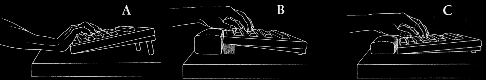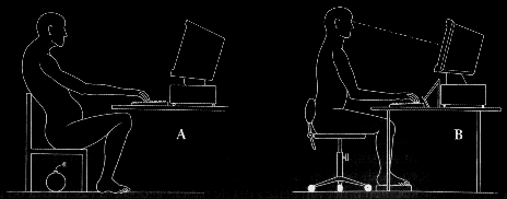 5 Houding ![]() Figuur 1 Zithouding: A fout, B goed. De stoel moet niet te dicht hij de tafel staan en zodanig zijn versteld dat de zitting horizontaal is. De voeten moeten goed op de grond staan met een hoek van negentig graden in het enkel- en kniegewricht. Het onderste gedeelte van de rug (het heiligbeen) en de onderste lendenwervels moeten tegen de rugleuning steunen. De hoek tussen bovenbenen en (rechte) rug moet iets kleiner zijn dan 90 graden. De bovenarmen moeten voor het lichaam gebracht worden en de schouders moeten ontspannen zijn en mogen niet worden opgetrokken. De ellebogen moeten niet zijwaarts maar recht voor het lichaam gehouden worden. De hoek tussen boven- en onderarm moet iets groter dan negentig graden zijn. Bij het typen moet de hele arm van links naar rechts meegenomen worden en moet niet alleen de pols zijwaarts gebogen worden, want in het laatste geval wordt het polsgewricht verkeerd belast (figuur 2). ![]() Figuur 2 Goede handhouding: de hand is in het verlengde van de onderarm. A fout, B goed, C fout. Tijdens het typen en bij het gebruik van de muis moet de pols niet op de tafel (of 'gel pad') rusten maar vrij zijn, en de hand moet zich in het verlengde van de onderarm bevinden (figuur 3). ![]() Figuur 3 A Foutieve stand van de pols (de hand is niet in het verlengde van de onderarm) en goede stand van het toestenbord; B goede stand van de hand en foutieve stand van het toetsenbord; C goede stand van de hand en goede stand van het toestenbord. Het is belangrijk met een flexibele pols en met gebogen flexibele vingers te typen zonder veel druk uit te oefenen op de toetsen (figuur 4). ![]() Figuur 4 Licht aanslaand toetsenbord en bebogen flexibele vingers. Daarvoor is een licht aanslaand toetsenbord nodig. De soort muis lijkt in de praktijk niet erg van belang te zijn, evenmin als de vorm van het toetsenbord. In rust worden de polsen op de 'gelpad' gelegd, zodat de handen en vooral de vingers zich goed kunnen ontspannen (figuur 5). ![]() Figuur 5 Laat de pols in ruststand op het 'gelpad' rusten. Het is verstandig na iedere tien minuten even de polsen en armen los te zwaaien en de schouders los te schudden. Uitgaande van het op het beeldscherm lezen van letters met een grootte van circa drie millimeter moet het scherm op 50-70 centimeter afstand van de beeldschermwerker recht voor hem staan op een beweegbare stelling, zodat hij al kijkende toch het hoofd recht (de nekwervels in het verlengde van de borstwervels) kan houden. Het beeldscherm mag niet te laag staan; er moet een kijkhoek van ongeveer 10 graden zijn (figuur 1B). Manuscripten moeten van 40 centimeter afstand gelezen worden vanaf een schuine teksthouder. Beeldschermwerkers moeten regelmatig hun ogen laten controleren zeker wanneer ze ouder dan veertig jaar zijn, omdat men bij visusstoornissen vaak ongemerkt een verkeerde houding achter het beeldscherm aanneemt. Tevens kan een aanpassing van de bureaustoel nodig zijn daarvoor moet de rugleuning naar voren kunnen, de stoel moet in hoogte verstelbaar zijn, de armleuningen moeten met schuimrubber bekleed zijn en verstelbaar zijn of verwijderd kunnen worden. Bij een goede zit zijn armleuningen niet nodig en worden ze een last. Wanneer de voeten niet op de grond kunnen steunen, moet een recht voetenbankje worden gebruikt. Het te dragen schoeisel moet een platte hak hebben. Het bureau waarop het toetsenbord en het beeldscherm staan moet in hoogte verstelbaar zijn. Aanvullend kunnen armsteunen (de zogenaamde Ergoreststeunen die in het horizontale vlak kunnen meebewegen) aan het bureau worden bevestigd, om de armen te leren welke positie ze moeten aannemen. Uit: Behandeling en preventie van RSI, M.D.F. van Eijsden-Besseling, 1998 |